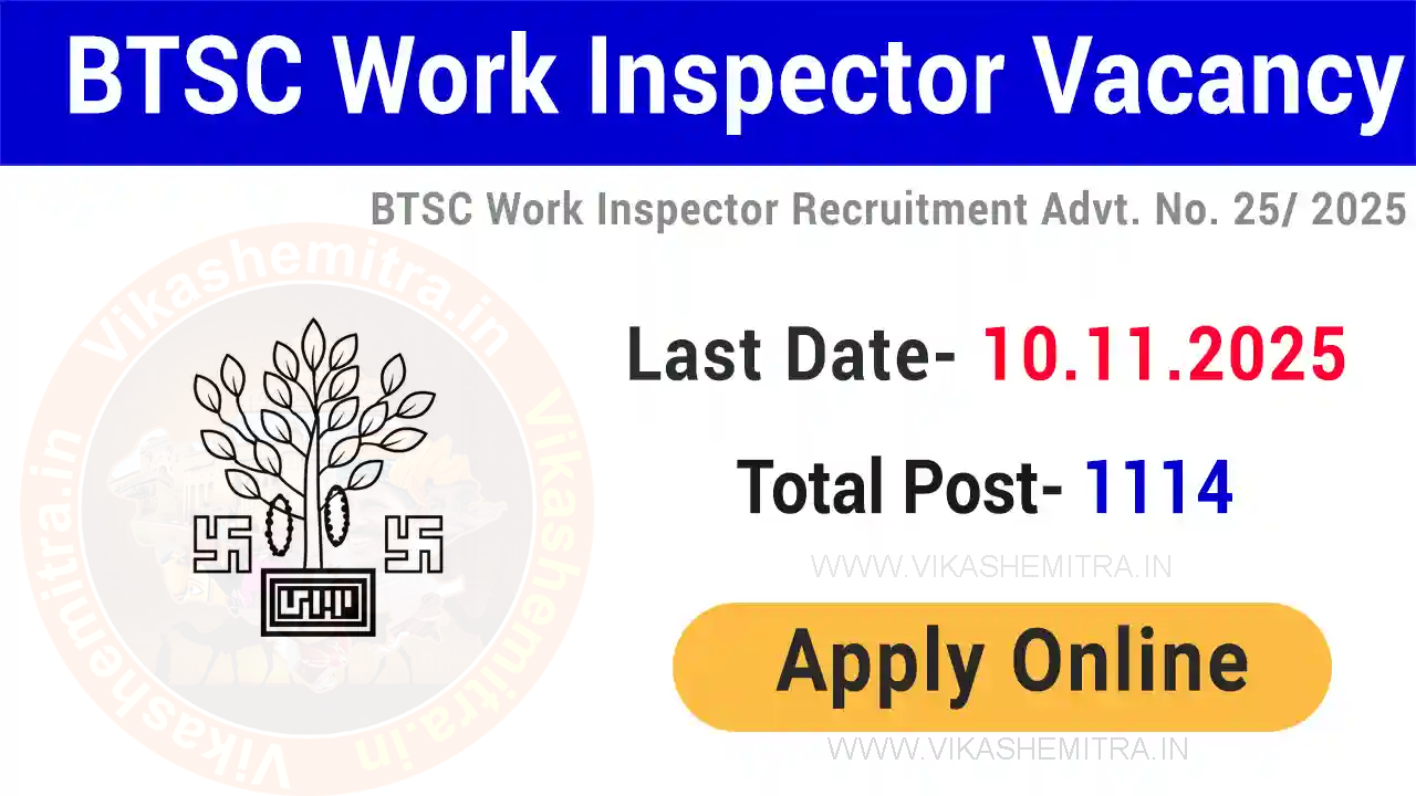 The Bihar Technical Service Commission (BTSC) has officially announced the BTSC Work Inspector Recruitment 2025 for 1114 posts. This recruitment is a great opportunity for candidates seeking a government job in Bihar. Eligible candidates can apply for the Bihar Work Inspector Online Form 2025 from 10 October 2025 to 10 November 2025.